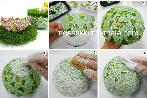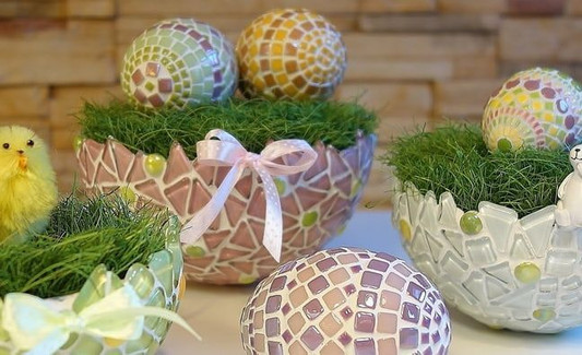 Create a beautifully spring-inspired Easter bowl using mosaic! Cover a half plastic ball with mosaic pieces and sow Easter grass inside. Beautiful Easter eggs and bowls made with mosaic. Easter crafting – a stunning mosaic bowl.