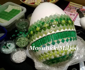 Start gluing from the middle of the egg. Attach 1x1 cm square tiles in three rows, then Soft Glass pieces towards one end. Work in small sections and leave 2 mm gaps. Avoid glue on fingers and tile surfaces – wipe off immediately if needed. Ensure good ventilation.